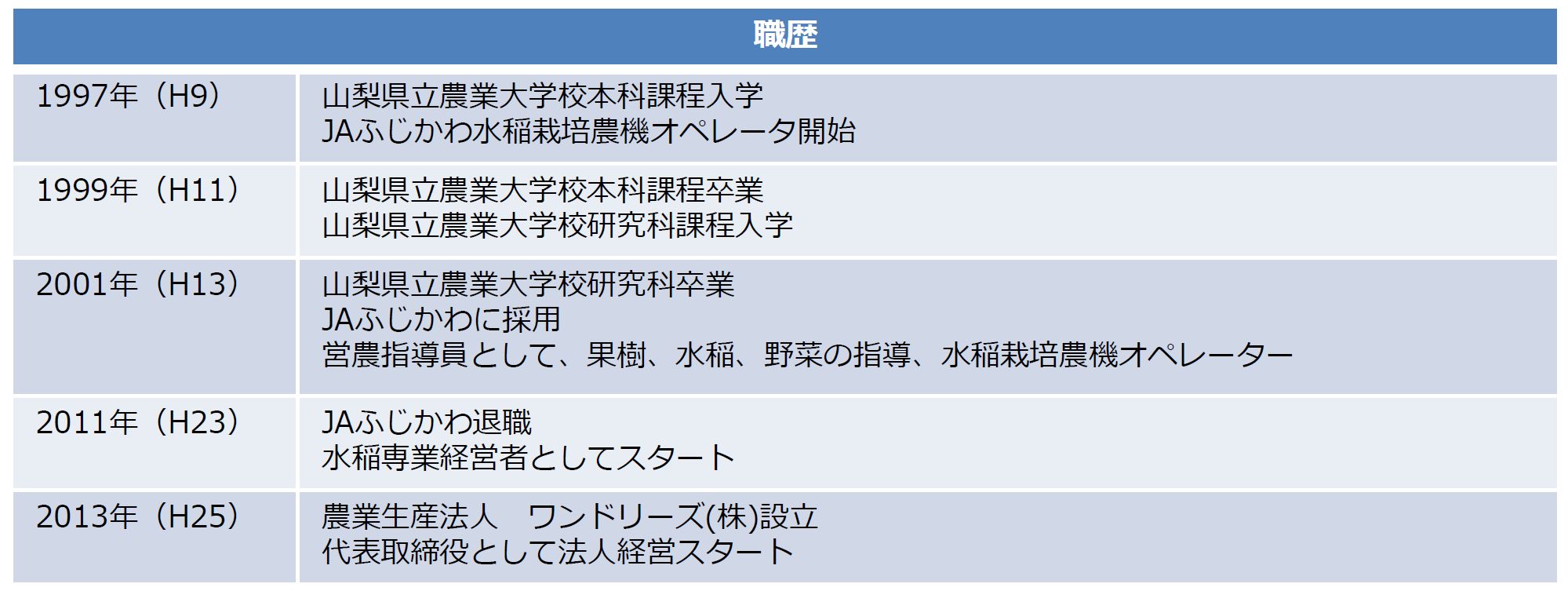 酒米の栽培をはじめ、元JA勤務の経験を元に数多くの農作物の栽培を手掛ける。社訓は「若者が自らやりたくなるような農業」を実践すること。萬屋醸造店の中込氏とともに、講談社や山梨学院大学との日本酒共同開発などを行う。