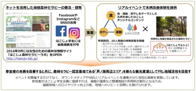 神奈川県が推進する「県西地域活性化プロジェクト」の一環として箱根町が主催する、 “未病”を改善することを目的としたプロジェクトです。 はこねのもり女子大学や昭和女子大学のマーケティングゼミの学生などが共に協力し、 これまで約3年の期間、 五感を使った各種体験イベントを企画・実施してまいりました。 この度、 芦ノ湖周辺エリアが森林セラピー(R)基地に認定されたことで、 今後はさらに森林セラピー(R)と関連させたオリジナルの未病改善体験イベントを定期的に開催していく予定です(次回は2017/11/19(日)の開催を予定しています)。