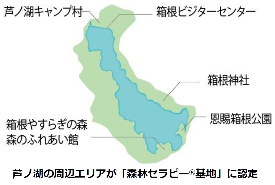 箱根町では「箱根やすらぎの森」を拠点として、 芦ノ湖周辺エリア全体が森林セラピー(R)基地として認定されました。 「箱根やすらぎの森」は、 芦ノ湖の南岸にあり面積は44.4ha。 富士山や芦ノ湖などの眺めが良く、 緑いっぱいの自然に囲まれています。