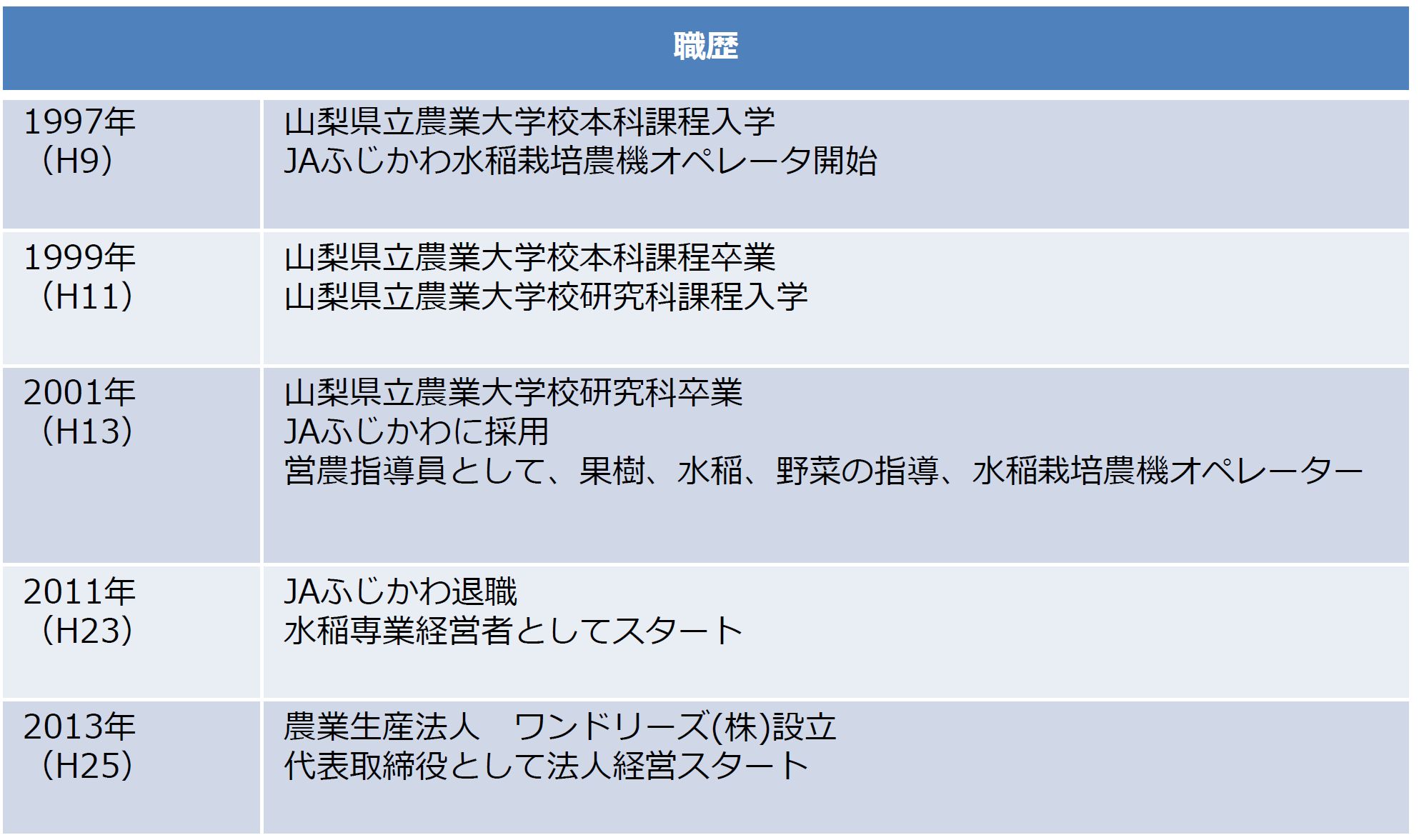 経歴:JA営農指導員10年、水稲栽培、農機オペレータ20年以上、水稲専業経営5年目