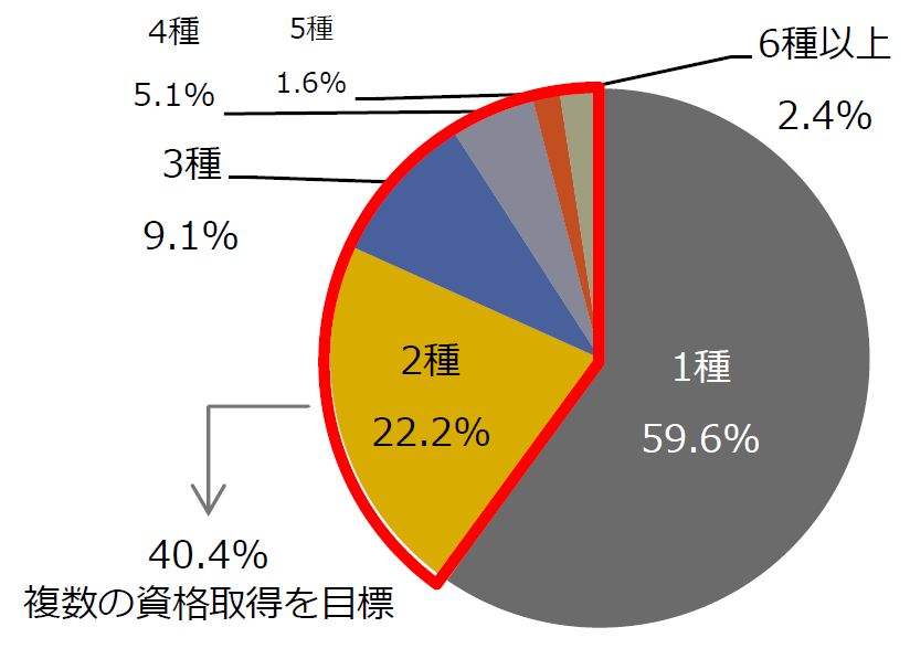 資格取得に向けて学習中、もしくは資格取得検討中と回答した668名の方に、目指している資格の数を聞いたところ、約6割が1種と回答する一方、2種以上と回答した方は全体の40.4%にのぼりました。