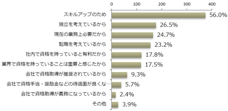 ・資格取得の目的、最多は「スキルアップのため」56.0%、次いで「独立のため」26.5%
