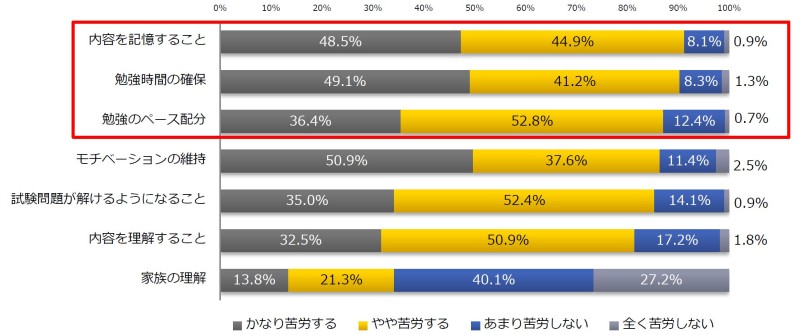 試験勉強で大変なことは「内容を記憶すること」「勉強時間の確保」「勉強のペース配分」