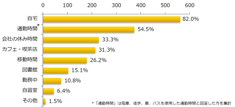 ・勉強する場所、最多は「自宅」(82.0%)、次いで「通勤時間」(54.5%)、「会社の休み時間」(33.3%)