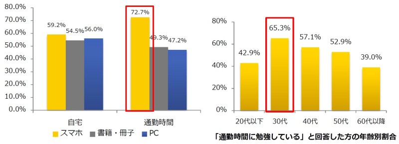 通勤時間に勉強している方はスマホ派が多く、年代別では30代が最多