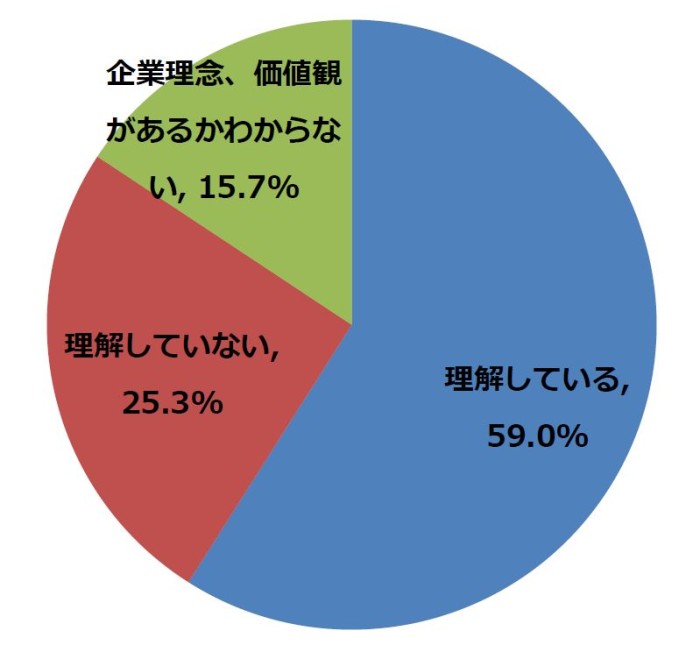 現在働いている会社の企業理念・価値観を理解しているか聞いたところ、「理解している」が59.0%、「理解していない」が25.3%という結果になりました。また、自分が働いている会社に「企業理念・価値観があるかわからない」という方も15.7%いることが分かりました。
