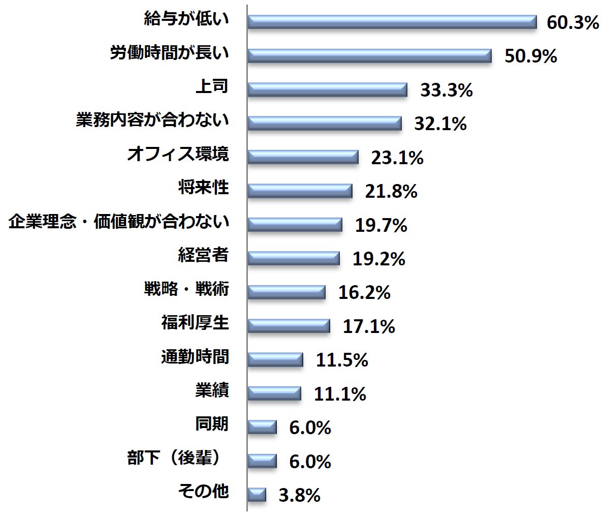 つづいて、Q2.で会社に対して不満を感じていると回答した234名を対象に、会社に対する不満の内容を聞いたところ、最も多かったのが「給与が低い(60.3%)」、次いで「労働時間が長い(50.9%)」、「上司(33.3%)」でした。