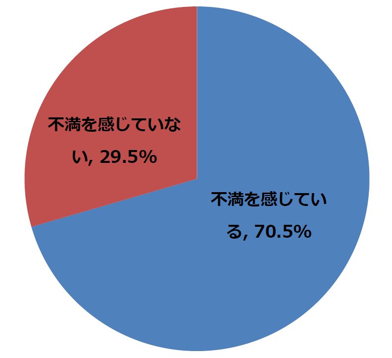 現在働いている会社に不満を感じているかを聞いたところ、「不満を感じている」と答えた方が70.5%、「不満を感じていない」と答えた方が29.5%という結果になりました。
