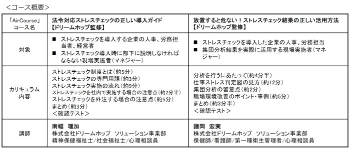 メンタルヘルス対策ソリューションを提供する株式会社ドリームホップ(本社:東京都新宿区、代表取締役:稲垣 義文、以下ドリームホップ)と、企業向け社員教育クラウドサービス「AirCourse」を提供するKIYOラーニング株式会社(本社:東京都港区、代表取締役社長:綾部 貴淑、以下KIYOラーニング)は、企業や事業所がストレスチェックを導入する際のポイントをわかりやすくまとめた「法令対応ストレスチェックの正しい導入ガイド」と、ストレスチェック実施後の活用ポイントをまとめた「放置すると危ない!ストレスチェック結果の正しい活用方法」を、「AirCourse」に新設します。