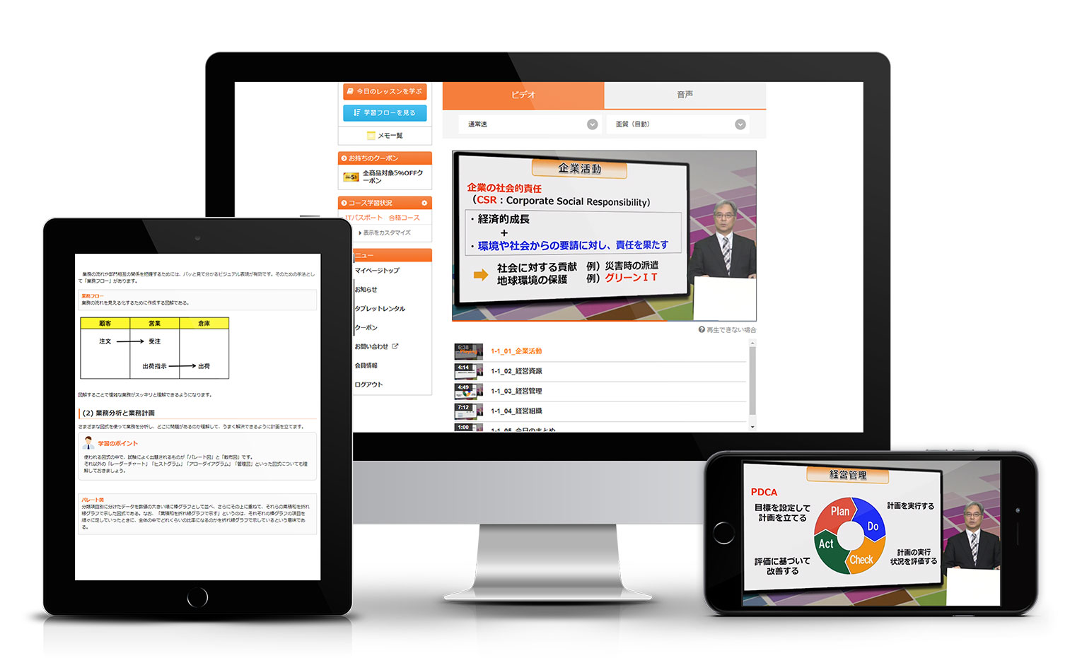 出題範囲が広い試験のため、深堀りし過ぎず、基本となる要素を着実に身につけることが重要です。問題を繰り返し行い、専門用語を定着させられるよう、知識をインプットしやすい“動画講座”、 ”暗記ツール型WEBテキスト”、学んだことを試しながら覚える一問一答形式の”演習問題”、”過去問題”により、インプット学習とアウトプット学習をバランスよく行えます。スマホやタブレット、パソコン、携帯音楽プレーヤーを使って手軽に学習できるため、忙しい方にも短期間で合格を目指せます。