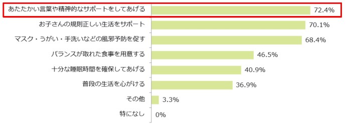 全国の明光義塾の教室長301名を対象に、受験生をもつ保護者にお願いしたいことを聞いたところ、最も多かったのが「あたたかい言葉や精神的なサポートをしてあげる(72.4%)」でした。受験生にとって不安や緊張の連続であるこの時期、保護者の方からのあたたかな言葉が一番の安心であり、パワーに繋がるようです。次に多かったのが「お子さんの規則正しい生活をサポート(70.1%)」、「マスク・うがい・手洗いなどの風邪予防を促す(68.4%)」と続きました。