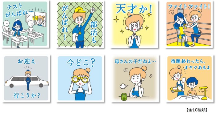 なかなか素直に伝えることができないことも多い我が子への応援メッセージを、ちょっとユニークであたたかな母親のイラストで表現しました。様々な生活シーンに対応したメッセージスタンプ画像は全部で10種類。メールやLINE等のメッセンジャーアプリにご利用可能です。新入学・新学年と新たな環境に進んでいくお子さまの応援に是非ご利用ください。