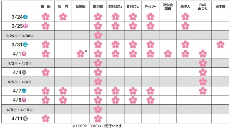 ■お花見周遊船【和船】:3月24日(土)、25日(日)、31日(土)、4月1日(日)、4日(水)、7日(土)、8日(日)、11日(水)9:30~14:30受付