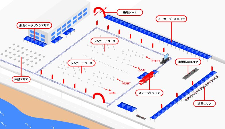 ジムカーナコースを囲むように試乗会ブース、各出展社ブース、カスタム車両展示ブースを設けます