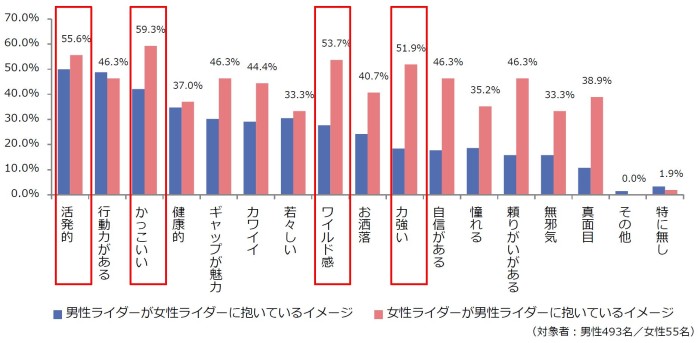 集計したデータを男女別でみると、女性ライダーが男性ライダーに抱くイメージは男性からのものより全体的にポイントが高く、半数以上が「かっこいい(59.3%)」、「活発的(55.6%)」、「ワイルド感(53.7%)」、「力強い(51.9%)」というポジティブなイメージを抱いていることが分かりました。
