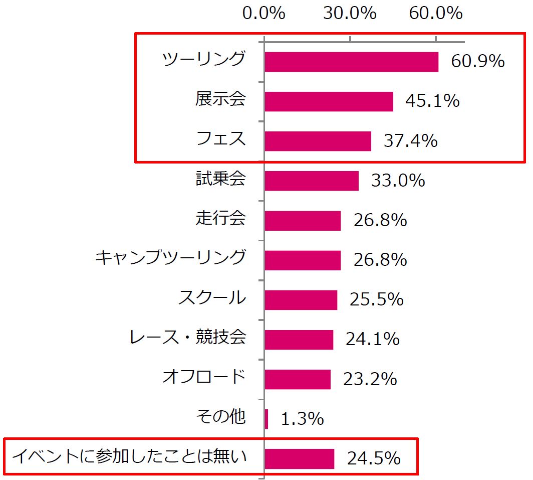これまでに参加したことのあるバイクイベントを聞いたところ、最も多かったのが「ツーリング(60.9%)」で、次いで「展示会(45.1%)」、「フェス(37.4%)」と続きました。一方で今まで一度もイベントに参加したことのない方も、24.5%いることが分かりました。