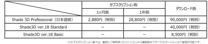 Shade3Dはver.18より、ダウンロード版と1ヶ月単位から利用可能なサブスクリプション版の2種類となります。建築・製造業界をはじめ、様々な業種で表現豊かで利便性の高い3DCADのニーズが高まる中、「Shade3D」を通して3DCADを始めるきっかけを少しでも多くの方にご提供できれば幸甚です。