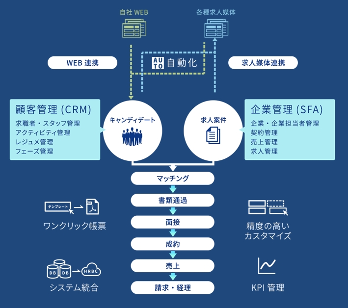 マッチングビジネスの根幹となる、求職者の履歴書管理や選考プロセス管理、求人媒体との連携など、人材紹介や人材派遣、再就職支援事業などあらゆる人材ビジネスに関わる企業の事業活動を、クラウドサービスで支援いたします。