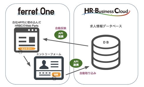 「HRBC」のデータベースで管理している求人情報を、「ferret One」で作成した自社ホームページに「HRBC」専用のコンポーネントを埋め込むだけで自動公開できます。