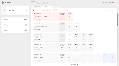 ・求人(JOB)、求職者(レジュメ)、選考プロセスの進捗・停滞状況が一目で可視化