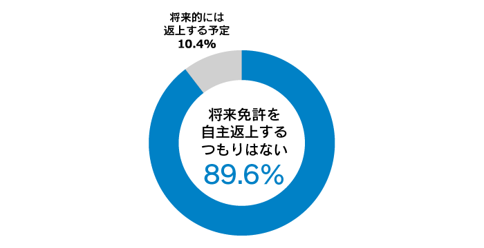 また、近年問題とされている高齢者の運転免許の自主返上について、対象者にいずれ自主返上をする意思があるかどうか聞いてみたところ、89.6%の方が将来的に自主返上するつもりはないと回答し、いつかは返上する予定と回答した方は10.4%に留まりました。