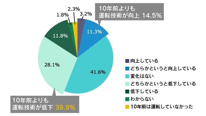 一方、10年前と比べて運転技術が向上したかどうかを聞いたところ、向上したと回答した方は14.5%に留まり、39.9%の方が以前よりも運転技術が低下していると回答しました。