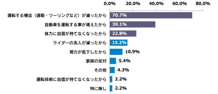 乗車頻度が減った理由、最多は「運転する機会(通勤・ツーリングなど)が減ったから」70.7%