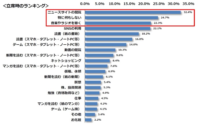 通勤電車内で立っている時にどのように時間を過ごしているか聞いたところ、第1位は「ニュースサイトの閲覧(32.4%)」、第2位は「特に何もしない(24.7%)」、第3位は「音楽やラジオを聴く(22.3%)」でした。
