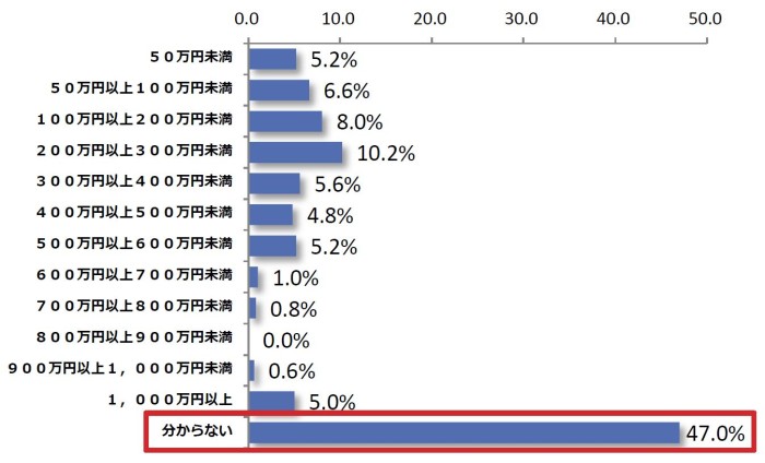 次に、がん治療の費用は、医療費総額でどれくらい必要だと思うかと聞いたところ、最も多かったのが「分からない(47.0%)」、続いて「200万円以上300万円未満(10.2%)」、「100万円以上200万円未満(8.0%)」と続きました。最多回答の「分からない」以外は、50万円未満から1,000万円以上まで幅広く回答が分かれる結果となりました。
