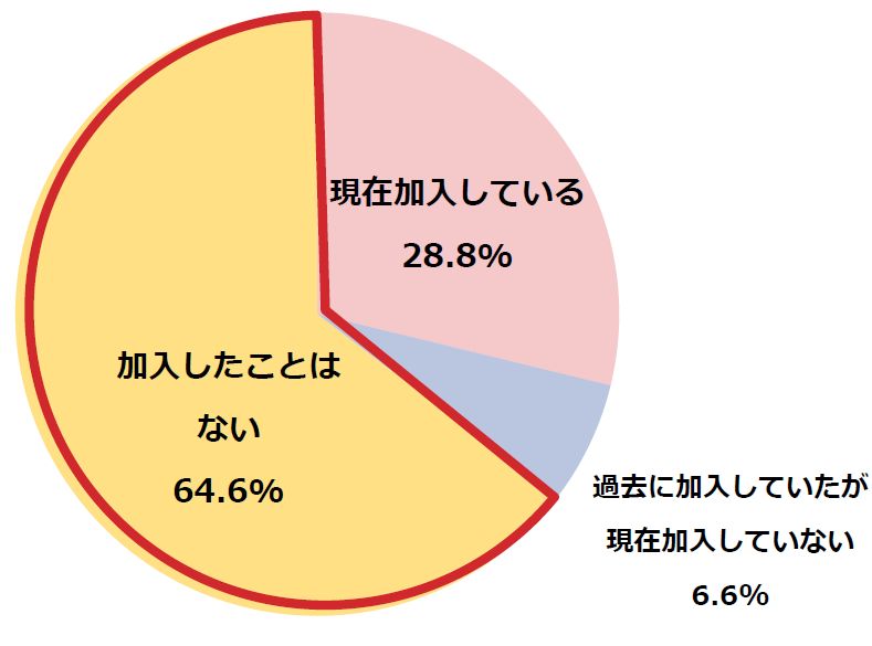 「がん保険」に加入しているかを聞いたところ、「現在加入している」と回答した方が28.8%、「過去に加入していたが現在加入していない」と回答した方が6.6%、「加入したことはない」と回答した方は64.6%という結果になりました。
