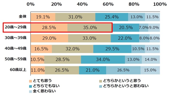 年代別に見てみると、「とても思う」、「どちらかというと思う」と回答した方は、20代で63.5%、30代で62.0%、40代で48.5%、50代で39.0%、60歳以上で37.5%と最も通勤電車内での時間を自身の成長に使いたいと考えているのは20代であることが分かりました。