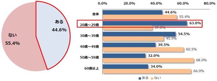 過去1年以内に通勤電車内で勉強した経験があるかを聞いたところ、「ある」と回答した方が44.6%、「ない」と回答した方が55.4%という結果になりました。
