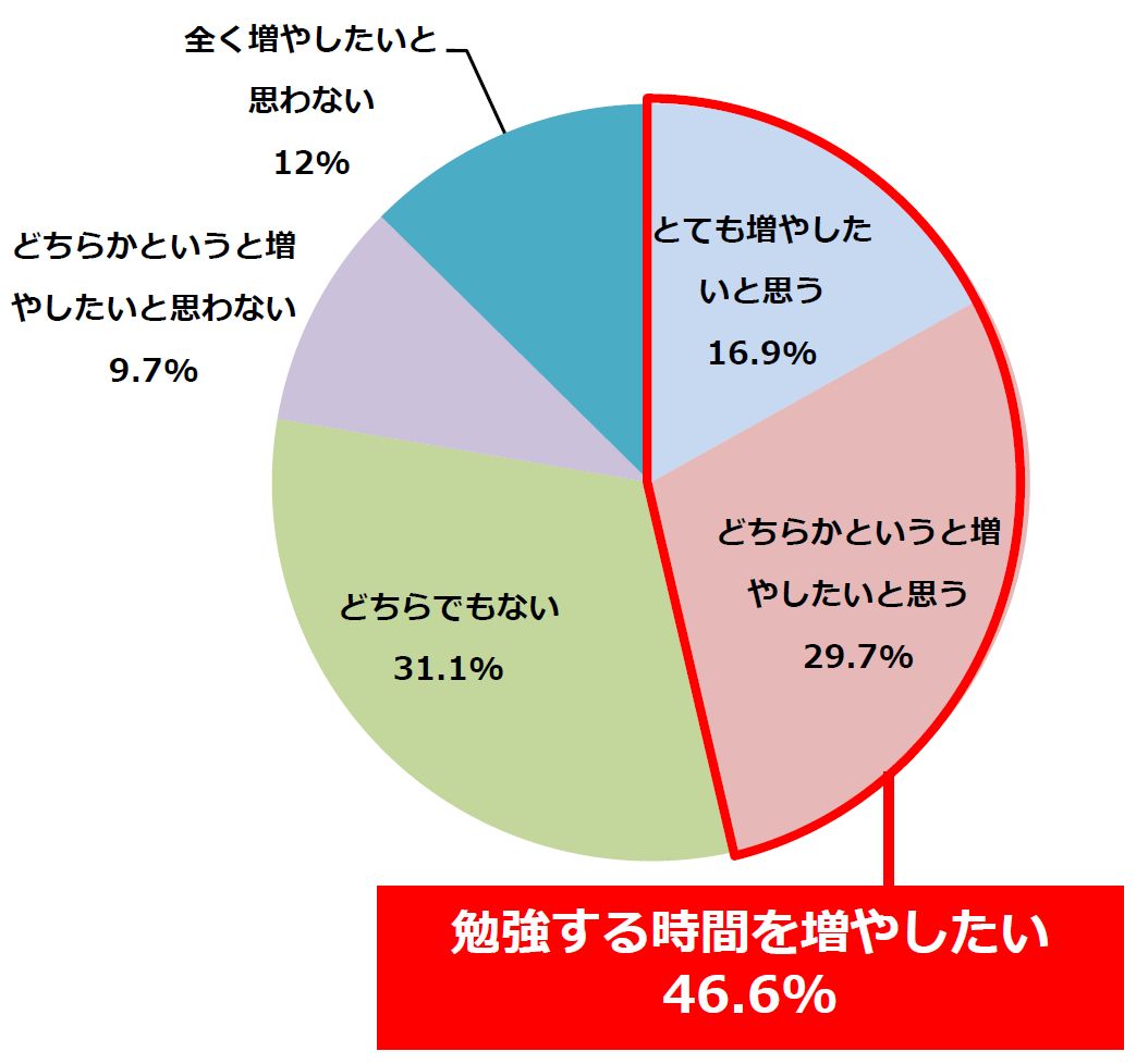 一方で「どちらかというと増やしたいと思わない(9.7%)」、「全く増やしたいと思わない(12.6%)」と合わせて22.3%のビジネスパーソンは、通勤環境に関わらず、通勤電車内での勉強の時間を増やしたいと思わないということが分かりました。
