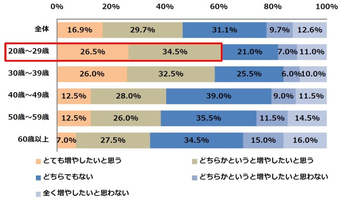 また、年代別に見てみると、「とても増やしたいと思う」、「どちらかというと増やしたいと思う」と回答した方は、20代で61.0%、30代で58.5%、40代で40.5%、50代で38.5%、60歳以上では34.5%と20代のビジネスパーソンが最も通勤電車で学ぶ時間を増やしたいと思っていることが分かりました。