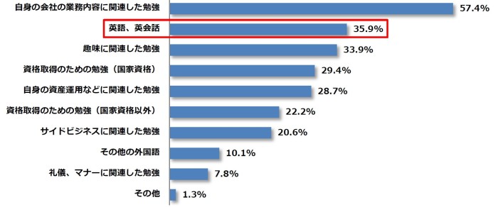 最後に、過去1年以内に通勤電車内で勉強したことがあるビジネスパーソン446名を対象にどのような勉強をしたかを聞いたところ、第1位が「自身の会社の業務内容に関連した勉強(57.4%)」、第2位が「英語、英会話(35.9%)」、第3位が「趣味に関連した勉強(33.9%)」という結果になりました。