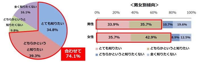 「世界遺産をもっと知りたい」と回答した方を男女別で比較をしてみると、男性が69.6%、女性が78.6%という結果になり、女性の方がより「世界遺産」に対して興味があることが分かりました。