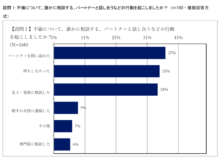 設問1:不倫について、誰かに相談する、パートナーと話し合うなどの行動を起こしましたか?(n=160・複数回答方式)