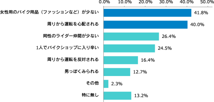 対象者にバイク女子としての悩みを聞いてみたところ、最も多かった回答が「女性用のバイク用品(ファッションなど)が少ない(41.8%)」で、続いて「周りから運転を心配される(40.0%)」と続きました。
