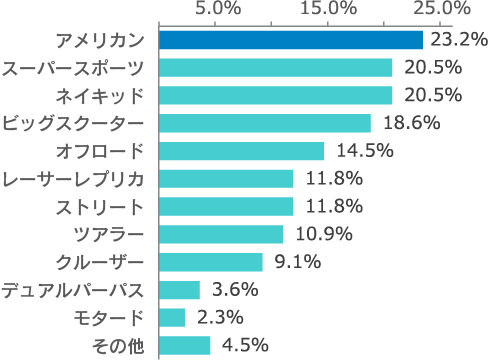 所有しているバイクの種類を聞いたところ、最も多かったのが「アメリカン(23.2%)」で、続いて「スーパースポーツ(20.5%)」「ネイキッド(20.5%)」が同率で続きました。