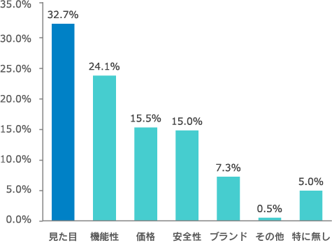 またバイクウェアを購入する際に、最も重要視するポイントを聞いたところ「機能性(24.1%)」「価格(15.5%)」「安全性(15.0%)」「ブランド(7.3%)」などを抑え、「見た目(32.7%)」が首位となりました。