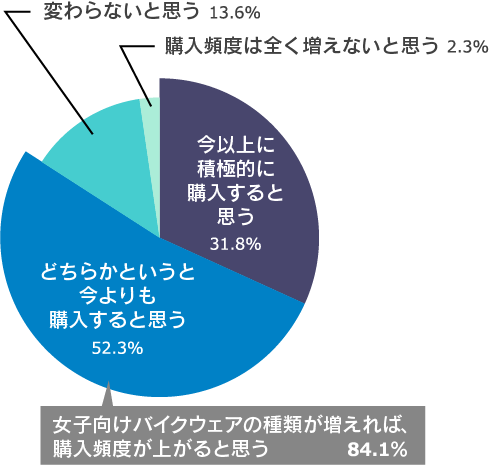 バイク女子の悩みでは「女性用のバイク用品(ファッションなど)が少ない(41.8%)」という回答が多く見受けられました。そこで女性向けバイクウェアの種類が今よりも拡充すれば、これまでよりもバイクウェアを購入する頻度が上がると思うかを聞いたところ、「今以上に積極的に購入する」が31.8%、「どちらかというと今よりも購入すると思う」が52.3%と、合わせて84.1%のバイク女子が、女性向けバイクウェアの種類が増えれば購入頻度も増えると思うと回答しました。