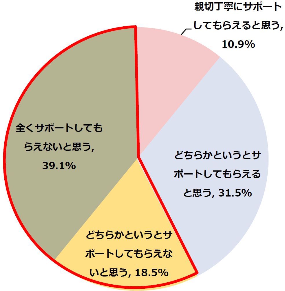一方で、「全くサポートしてもらえないと思う」と回答した方は39.1%と最も多く、「どちらかというとサポートしてもらえないと思う」と回答した18.5%の方と合わせると、57.6%と半数以上の会社員の方が、自身の会社では従業員が「がん」になったとしてもサポートしてもらえないと思うと回答しました。