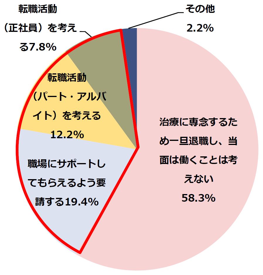 次に、自身の会社では「がん」になったとしてもサポートしてもらえないと思うと回答した180名の会社員を対象に、会社がサポートしてくれない場合の自身の行動を聞いたところ、最も多かったのが「治療に専念するため一旦退職し、当面は働くことは考えない(58.3%)」でした。また、「職場にサポートしてもらえるよう要請する(19.4%)」、「転職活動(パート・アルバイト)を考える(12.2%)」、「転職活動(正社員)を考える(7.8%)」と何らかの形での仕事の継続を望む会社員も39.4%存在しました。