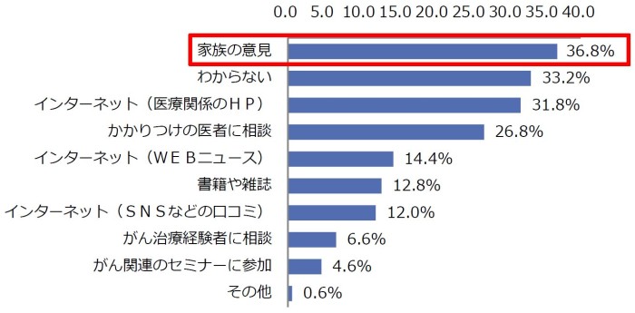 ・がんの治療法や病院選びで最も参考にするのは「家族の意見(36.8%)」