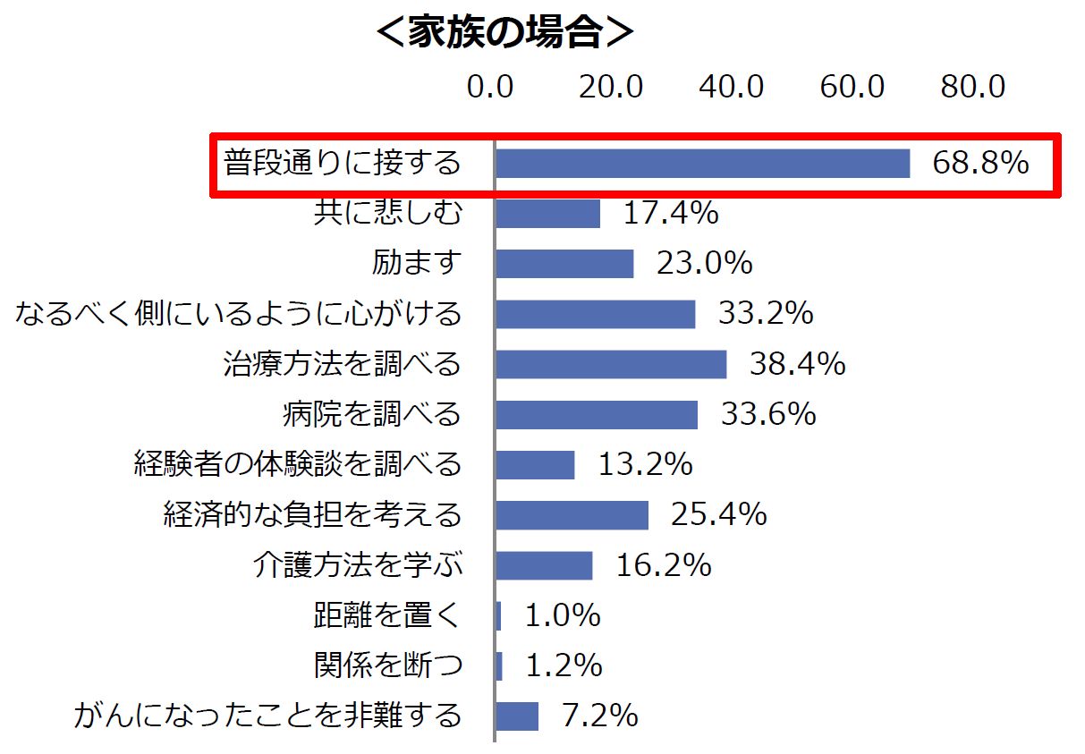 次に、もし自身の大切な人が「がん」だと分かった時にどのような行動をとるかを、それぞれパートナー(夫婦・恋人)、家族、友人の場合に分けて聞いたところ、最多回答は全て同じで「普段通りに接する」という結果でした。