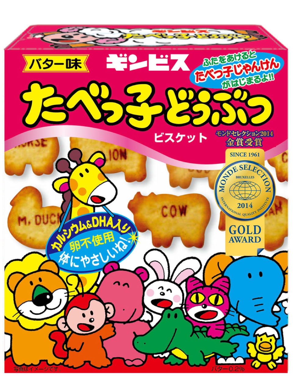 46種類の動物を形とアルファベットで表現したお菓子は、 当社の理念である「International(国際性)」「Independent(独創性)」「Instructive(教育性)」をふんだんに詰め込んだビスケットです。
