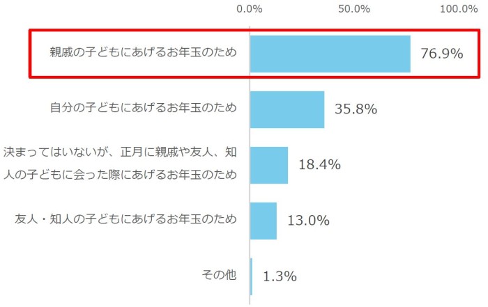 また、経済的な負担となると回答した386名を対象に、その理由を聞いたところ、最も多かった回答が「親戚の子どもにあげるお年玉のため(76.9%)」で、次いで「自分の子どもにあげるお年玉のため(35.8%)」と続きました。