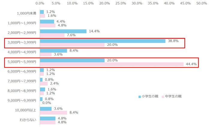 最適だと思うお年玉の金額、小学生の親は「3,000円台(38.8%)」、中学生の親は「5,000円台(44.4%)」が最多回答