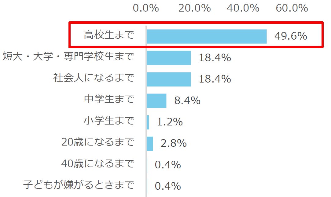 お年玉はいつまでもら(あた)えるべきと思うか聞いたところ、「高校生まで(49.6%)」と回答した方が最も多く、次いで「短大・大学・専門学校生まで(18.4%)」「社会人になるまで(18.4%)」と続きました。