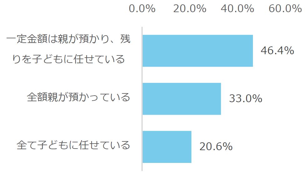 また子どもがもらったお年玉の管理をどのようにしているか聞いたところ、「一定金額は親が預かり、残りを子どもに任せている(46.4%)」が最も多く、次いで「全額親が預かっている(33.0%)」、「全て子どもに任せている(20.6%)」と続きました。